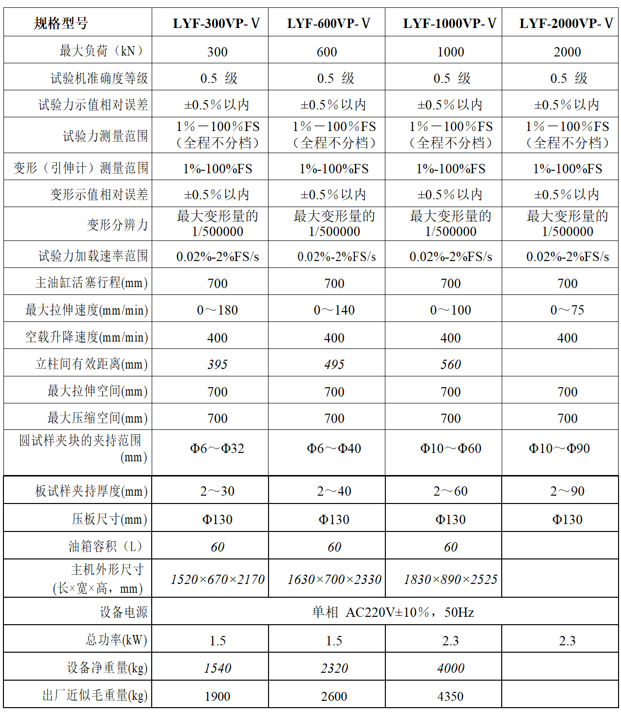 LYF-VP-Ⅴ系列 微机控制双空间电液伺服拉力试验机是平推夹具设备,采用人体工程学 结构设计,拉伸空间便于人员操作使用。其中:上横梁与中横梁之间为拉伸空间,主要进行对 试样的拉伸试验;中横梁与下横梁之间为压缩空间,主要用于计量局对设备进行校准标定;拉伸 空间和压缩空间均通过双油缸升降调整,替代传统丝杠传动机构。 该拉力机主要用于金属材料的拉伸试验(配套相应工装也可实现压缩、弯曲、剪切、抗折 等试验)。